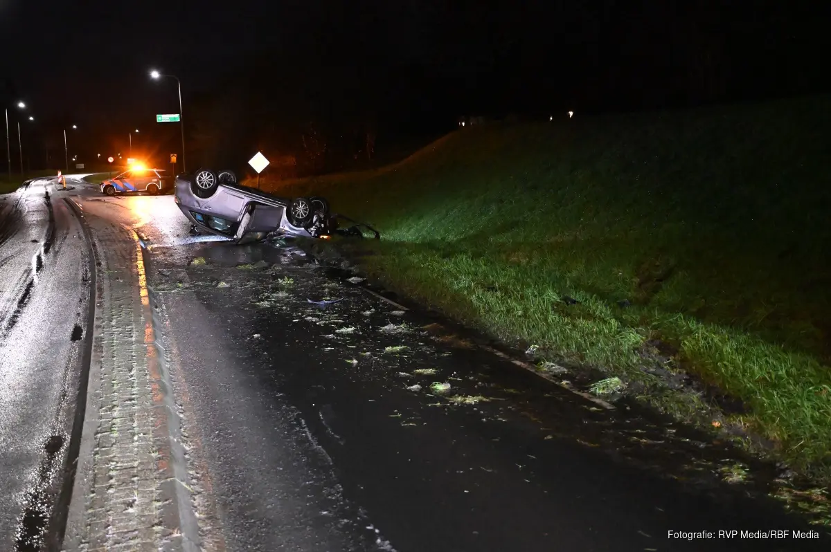 Het bleek te gaan, om een Seat Ibiza die op zijn kop lag. Op het wegdek lag een laagje ijs waardoor, het voertuig ging glijden en hierna in de berm belandde en vervolgens op het dak tot stilstand kwam.
