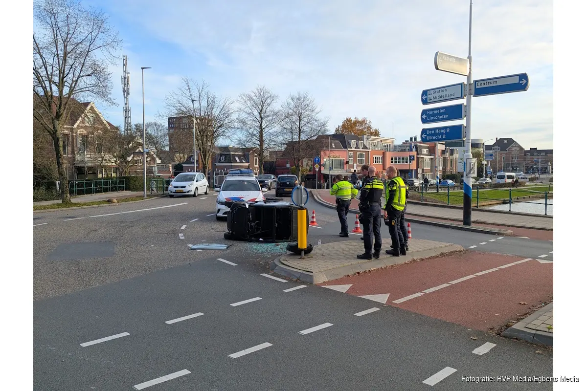 WOERDEN – Op de kruising van de Oostdam en de Stationsweg in Woerden zijn vanmiddag rond 14.05 uur twee voertuigen met elkaar in botsing gekomen. Door de klap kwam een elektrische Biro – een kleine stadsauto – op zijn kant terecht.