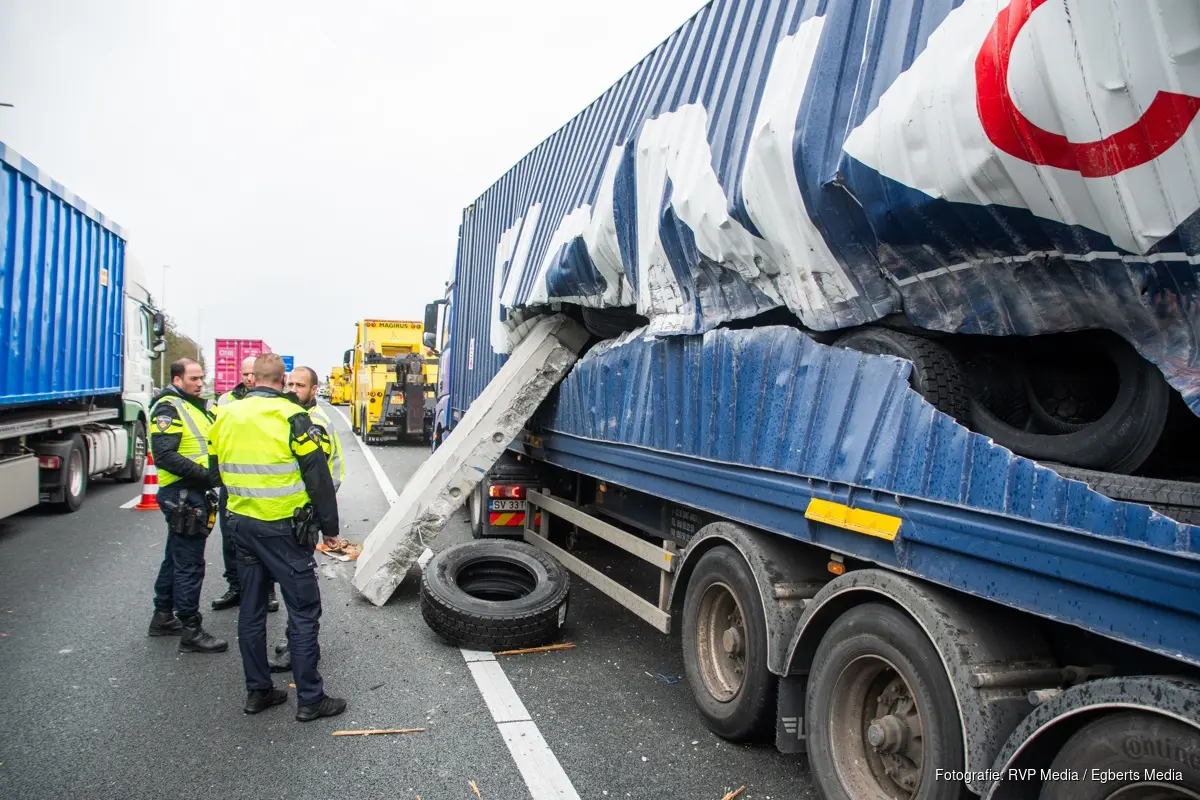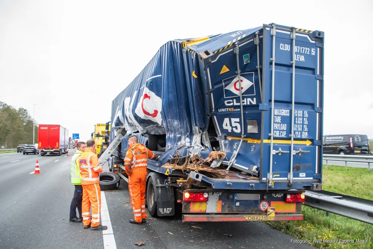De uitstekende lading boorde zich door de zeecontainer die de vrachtwagen met pech vervoerde. Een grote betonplaat kwam los en bleef tegen de zeecontainer achter. Er ontstond veel schade aan de zeecontainer, de lading en ook ligt de weg bezaaid met puin.