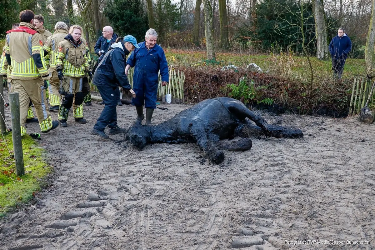 Het paard genaamd Darson zat helemaal onder de modder en werd met een tuinslang afgespoeld. Naar omstandigheden maakt paard Darson het goed.