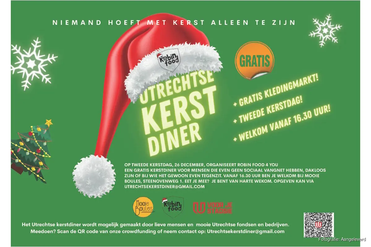 UTRECHT - Niemand hoeft met kerst alleen te zijn. Daarom organiseren de vrijwilligers van Robin Food 4 you op Tweede Kerstdag, vrijdag 26 december 2025, een groot kerstdiner voor meer dan tweehonderd Utrechters die wel een steuntje in de rug kunnen gebruiken. Mensen die eenzaam zijn, dakloos of door welke omstandigheden dan ook even geen sociaal vangnet hebben. Zij kunnen deze kerst aanschuiven voor een lekker kerstdiner in het recent geopende speellokaal Mooie Boules aan de Steenovenweg. Deze week is de crowdfunding om het diner mogelijk te maken gestart op de website www.voorjestadsie.nl.