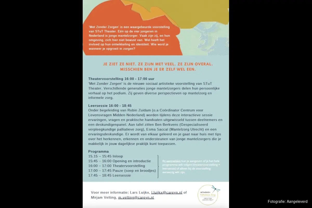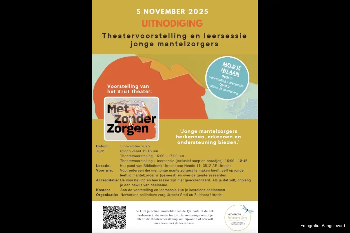 Kimberly, Dimitri, Karin en Sahhanim vertellen hun eigen verhaal. In een prachtig decor, bij betoverende muziek, in poëtische woorden, bij schitterend licht. Kom naar de theatervoorstelling ‘Met Zonder Zorgen’ van het STuT Theater op woensdag 5 november 2025. Deze bijzondere middag in Bibliotheek Utrecht (Neude 11) wordt georganiseerd door de netwerken Palliatieve Zorg Utrecht e.o.. De theatervoorstelling is gratis en toegankelijk voor iedereen die vanuit werk of privé geïnteresseerd is in het onderwerp.
